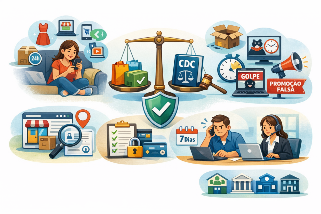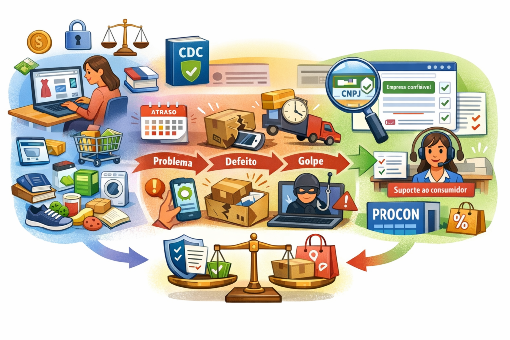 Ao longo do texto, você vai aprender como a lei protege quem compra pela internet, quais cuidados tomar antes de finalizar uma compra, o que fazer em casos de atraso, defeito, propaganda enganosa ou golpe, e onde buscar ajuda quando necessário.